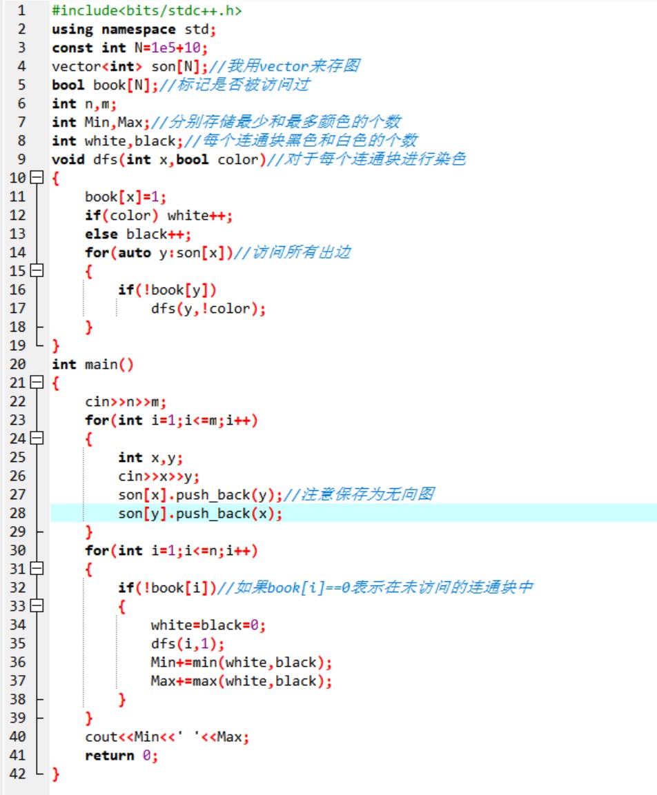 来自两所学校 $A$、$B$ 的 $n$ 名同学聚在一起相互交流。为了方便起见,我们把这些同学从 $1$ 至 $n$ 编号。他们共进行了 $m$ 次交流,第 $i$ 次交流中,编号为 $u_i, v_i$ 的同学相互探讨了他们感兴趣的话题,并结交成为了新的朋友。 由于这次交流会的目的是促进两校友谊,因此只有不同学校的同学之间会交流。同校同学并不会互相交流。 作为 $A$ 校顾问,你对 $B$ 校的规模非常感兴趣,你希望求出 $B$ 校至少有几名同学、至多有几名同学。