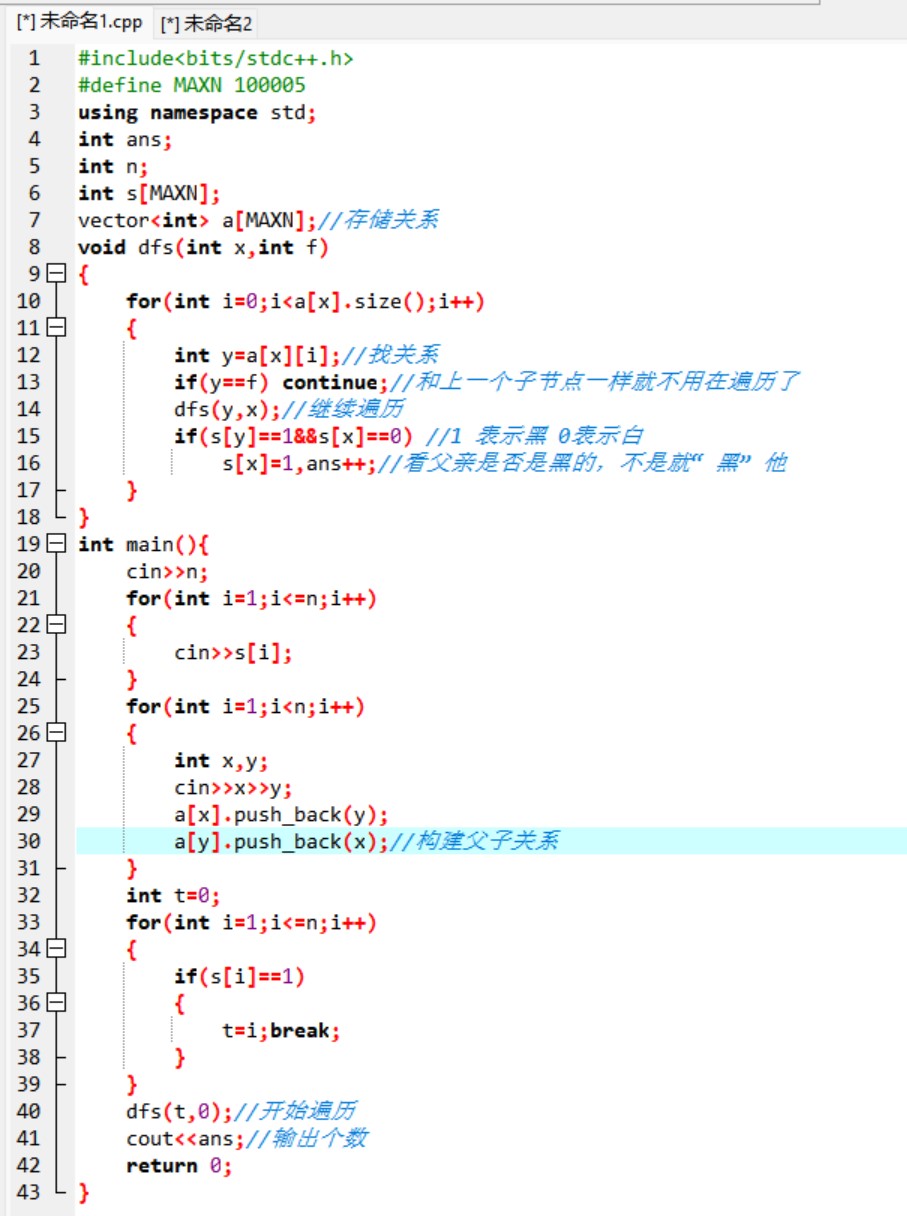 $2$|$30\%$ | $\leq 10^5$ | $0\leq a_i\leq 1$| 只有两个节点颜色为黑色
